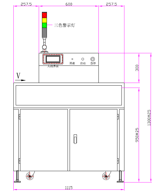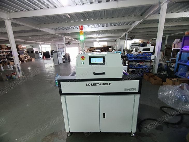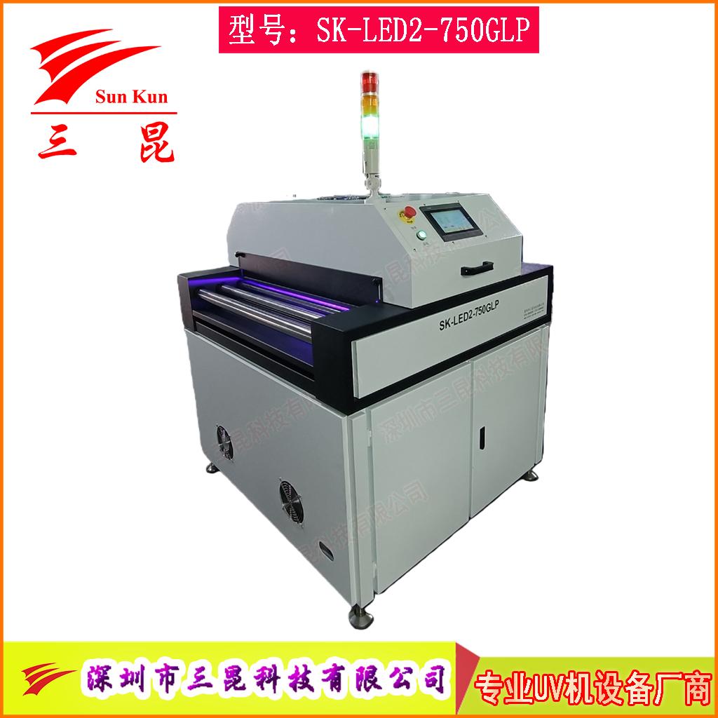 本機(jī)采用韓國(guó)進(jìn)口395nm高能LED燈珠,燈面尺寸750mm,采用超短滾筒式光源布局與不銹鋼滾筒輸送,入口高度50mm,輸送方向左→右,速度可無(wú)級(jí)調(diào)節(jié)0–7m/min;人機(jī)界面為觸摸屏控制,燈組可手動(dòng)高低升降以適配不同工件厚度。